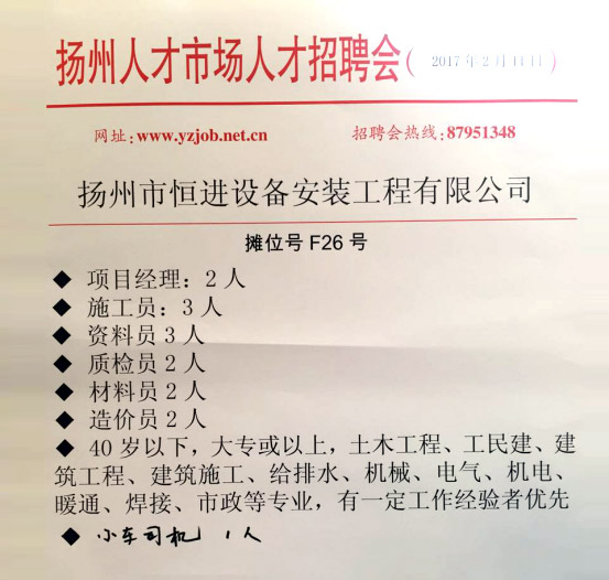 2017年2月11日上午,我公司參加邗江區(qū)2017年新春人力資源大型招聘會,會間收到應(yīng)聘人員自薦材料數(shù)十份。
